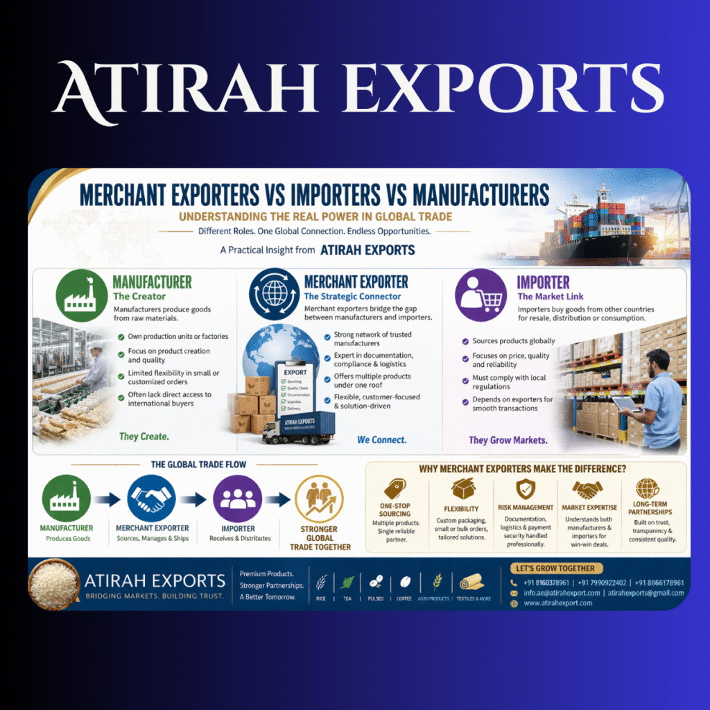 Merchant Exporters vs Importers vs Manufacturers: Understanding the Real Power in Global Trade Leave a Comment / Blog / atirahexports